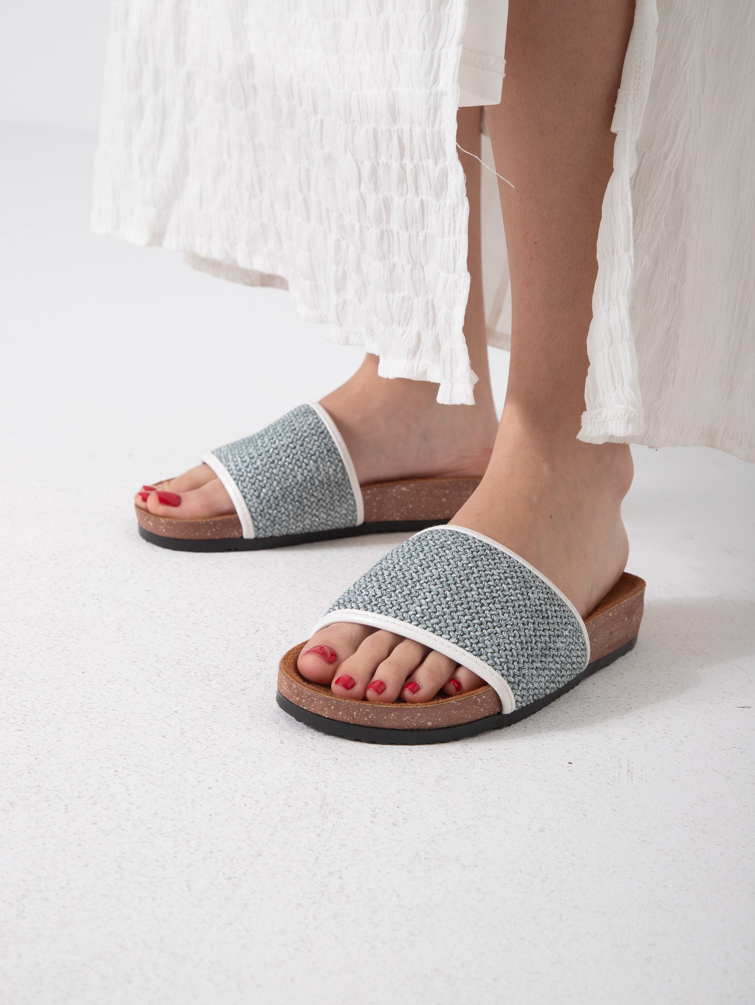 Introducing the Pure Thread Slide in blue. Made with high-quality materials, this sleek and stylish slide offers the perfect combination of comfort and durability. With its unique design and superior construction, this slide is perfect for any occasion. Upgrade your footwear game with the Pure Thread Slide.