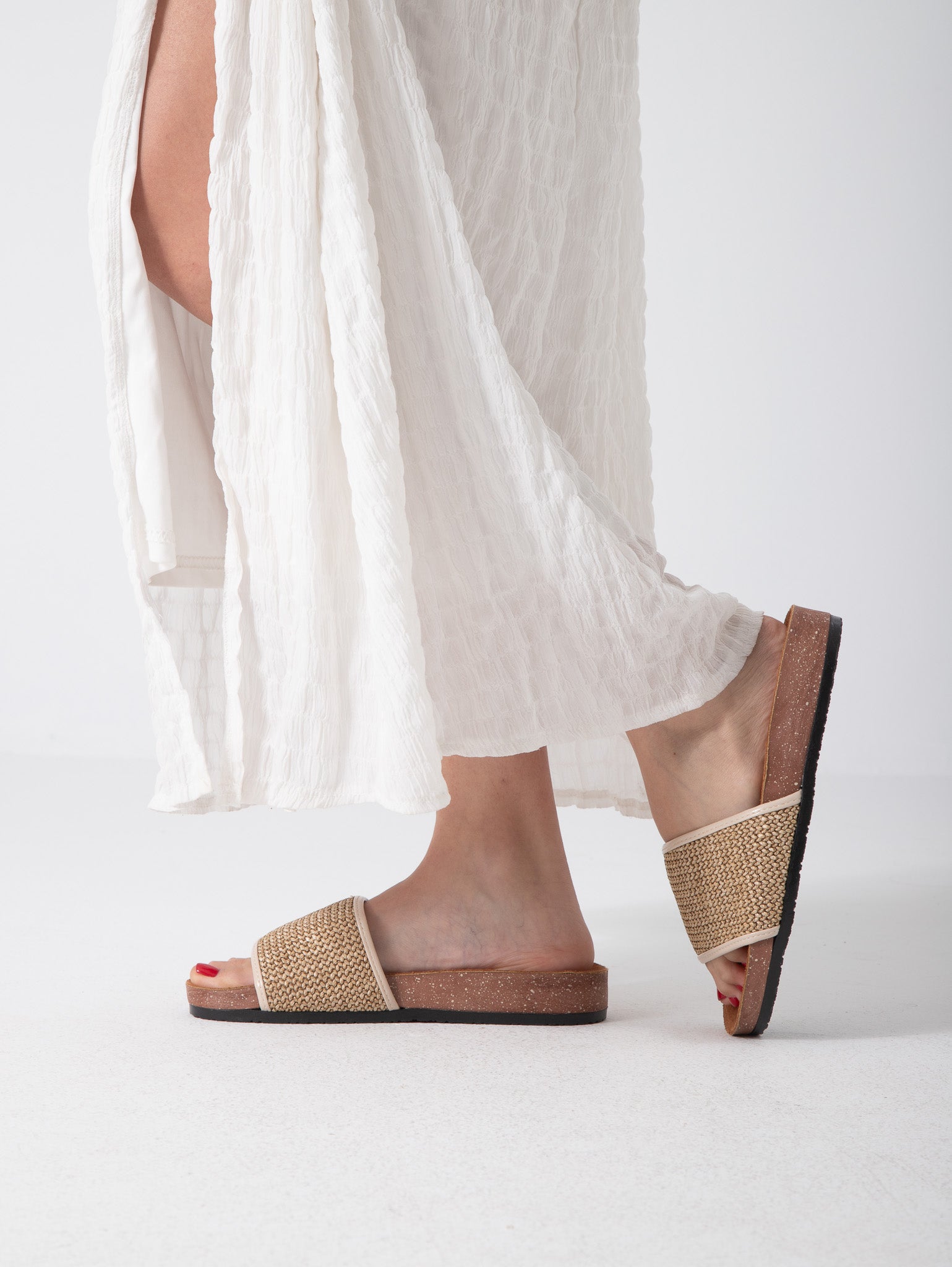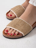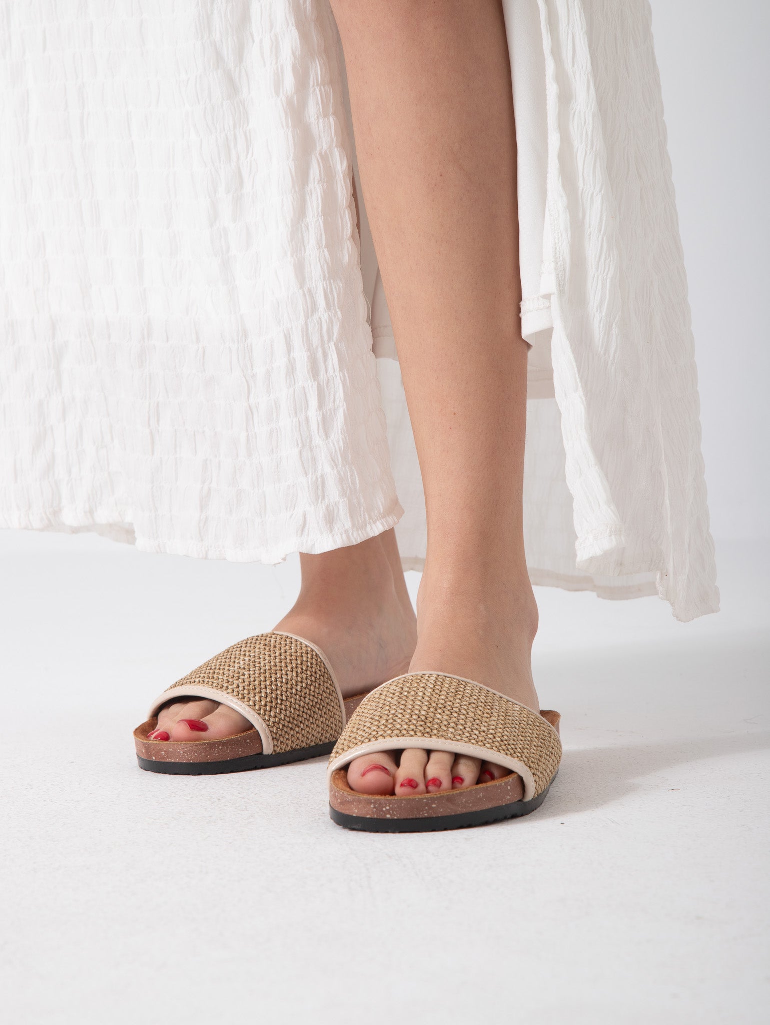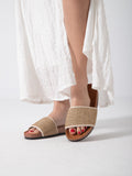 Introducing the Pure Thread Slide in cafe. This sleek, one-strap sandal features a comfortable and breathable design. Crafted with high-quality materials, it offers durability and style for any occasion. Perfect for those seeking a simple yet sophisticated look.