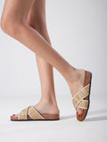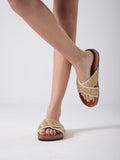 These beige woven crisscross strap slides combine comfort and style effortlessly. The intricately woven straps provide a secure fit while adding a textured, sophisticated look. Lightweight and easy to slip on, they are ideal for casual outings or relaxed indoor wear, offering both breathability and support throughout the day.