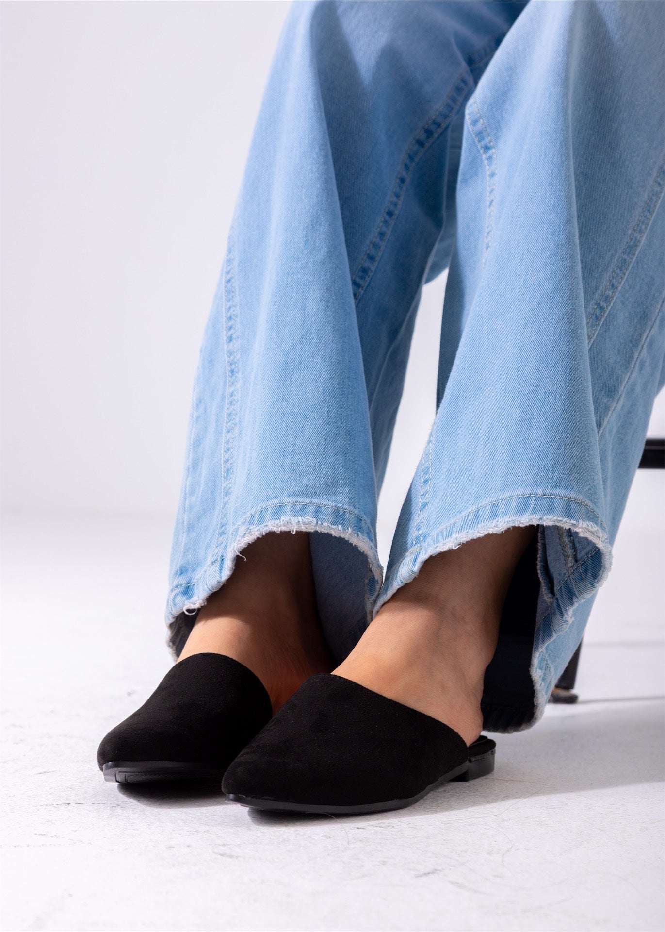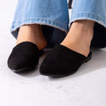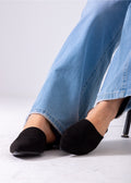 These black pointed toe suede mules blend refined style with comfort. Crafted from soft suede, they offer a sleek silhouette that elongates the foot, making them ideal for both professional and casual settings. The slip-on design ensures ease of wear, while the pointed toe adds a polished, sophisticated touch to any outfit. Perfect for those seeking versatile footwear that balances elegance and everyday practicality.