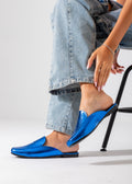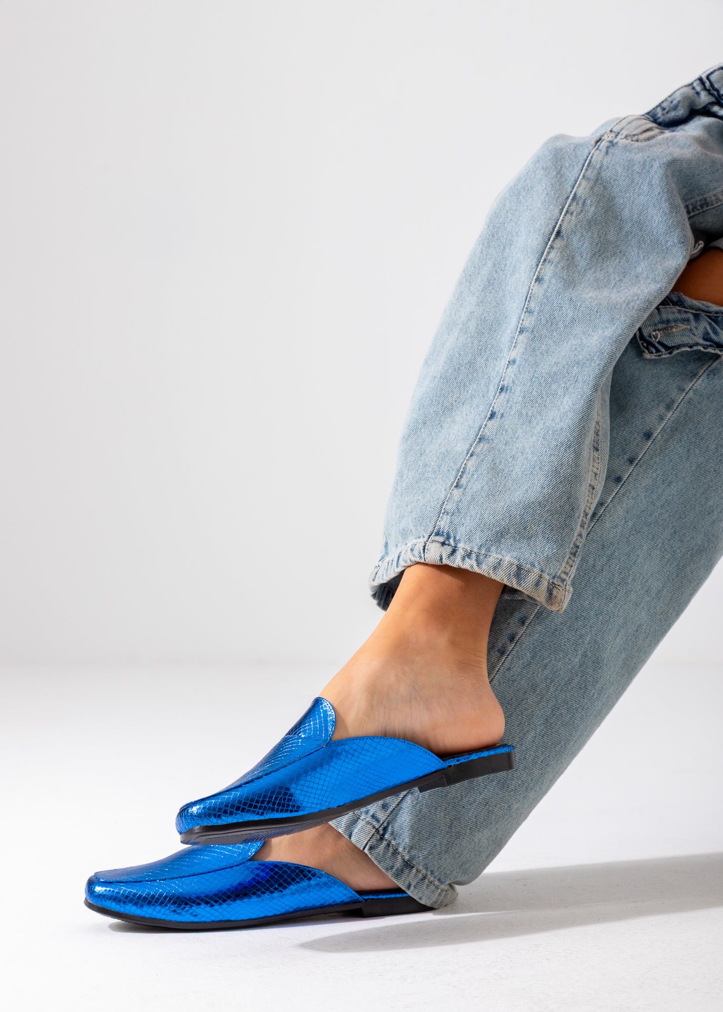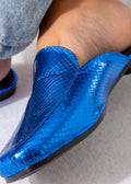These Metallic Snake-Embossed Mules in blue combine sophisticated texture with sleek design, offering both style and comfort. Crafted with a detailed snake-embossed metallic finish, they bring a refined edge to any outfit. The slip-on mule shape ensures easy wear, while the structured sole provides reliable support for daily use. Ideal for elevating your wardrobe with a subtle, expert touch of luxury.