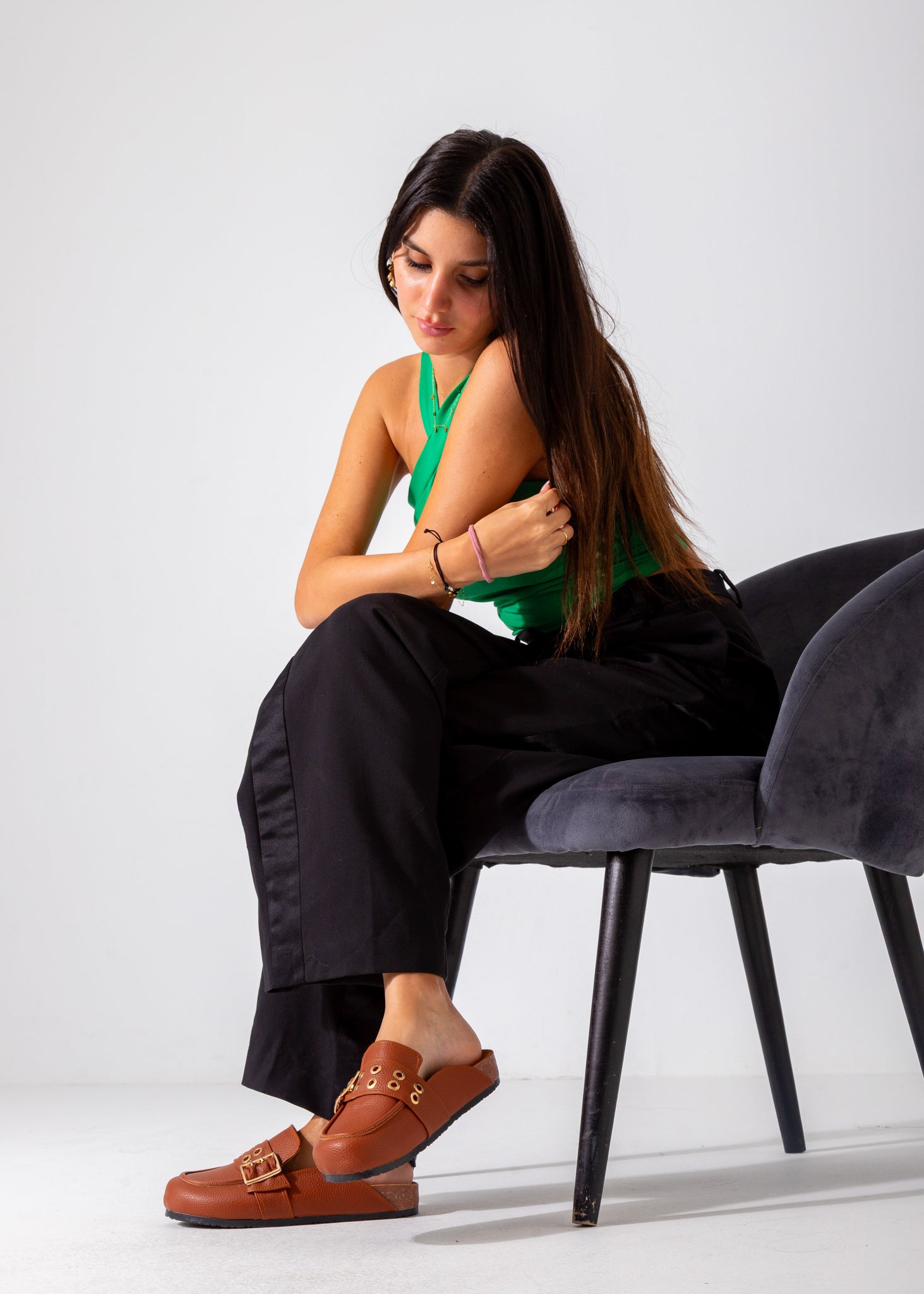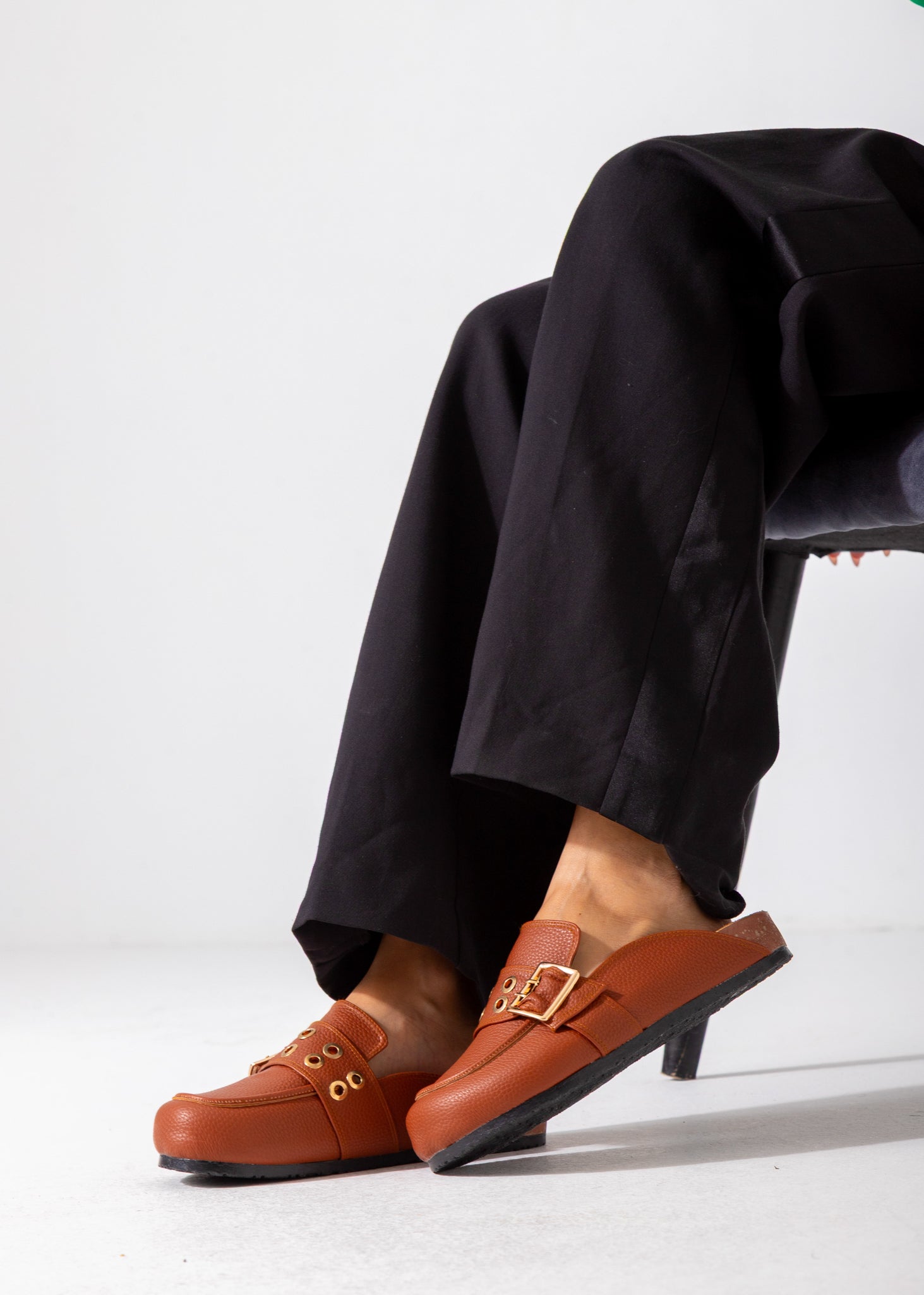 These Metallic Studded Buckle Clogs in camel combine durable design with stylish details. Featuring a secure buckle closure and metallic studs, they offer both a firm fit and a contemporary edge. The camel tone adds versatility, making them suitable for a variety of outfits while providing comfortable support for extended wear. Ideal for those seeking footwear that balances fashion with function.