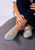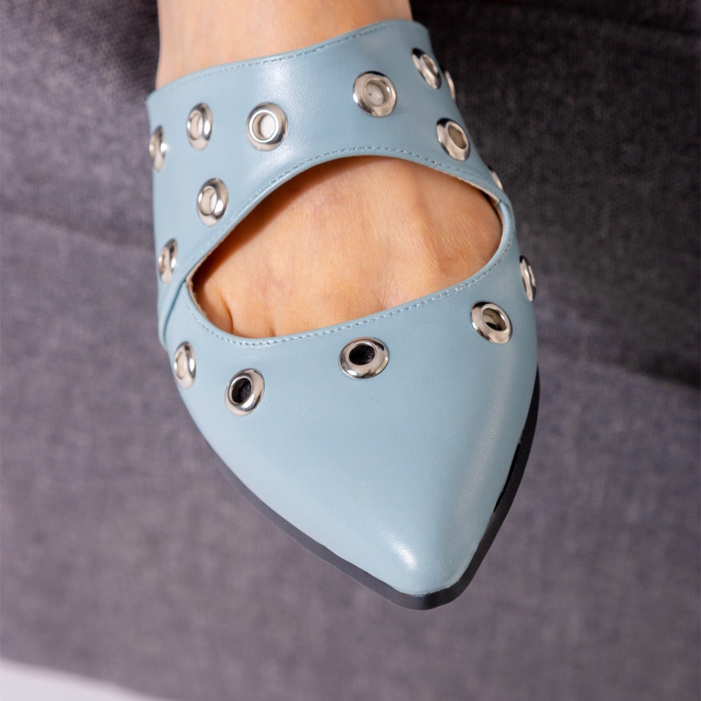 Elevate your footwear collection with the Studded Pointed Backless Mule in baby blue. Crafted for both style and comfort, this mule features a sleek pointed toe and elegant backless design, allowing easy wear and a chic silhouette. The studded accents add a touch of edgy sophistication, making it suitable for both casual and upscale occasions. Perfect for those seeking a refined yet bold statement in their footwear.