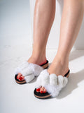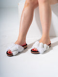 Indulge in cozy elegance with these braided faux fur slides. Designed with a wide, plush ruched strap for a cloud-like feel, these sandals feature a contoured footbed that mimics a cork-style base for all-day support. Whether you're at home or running a quick errand, these fluffy slides add a touch of luxury to your casual look.