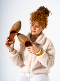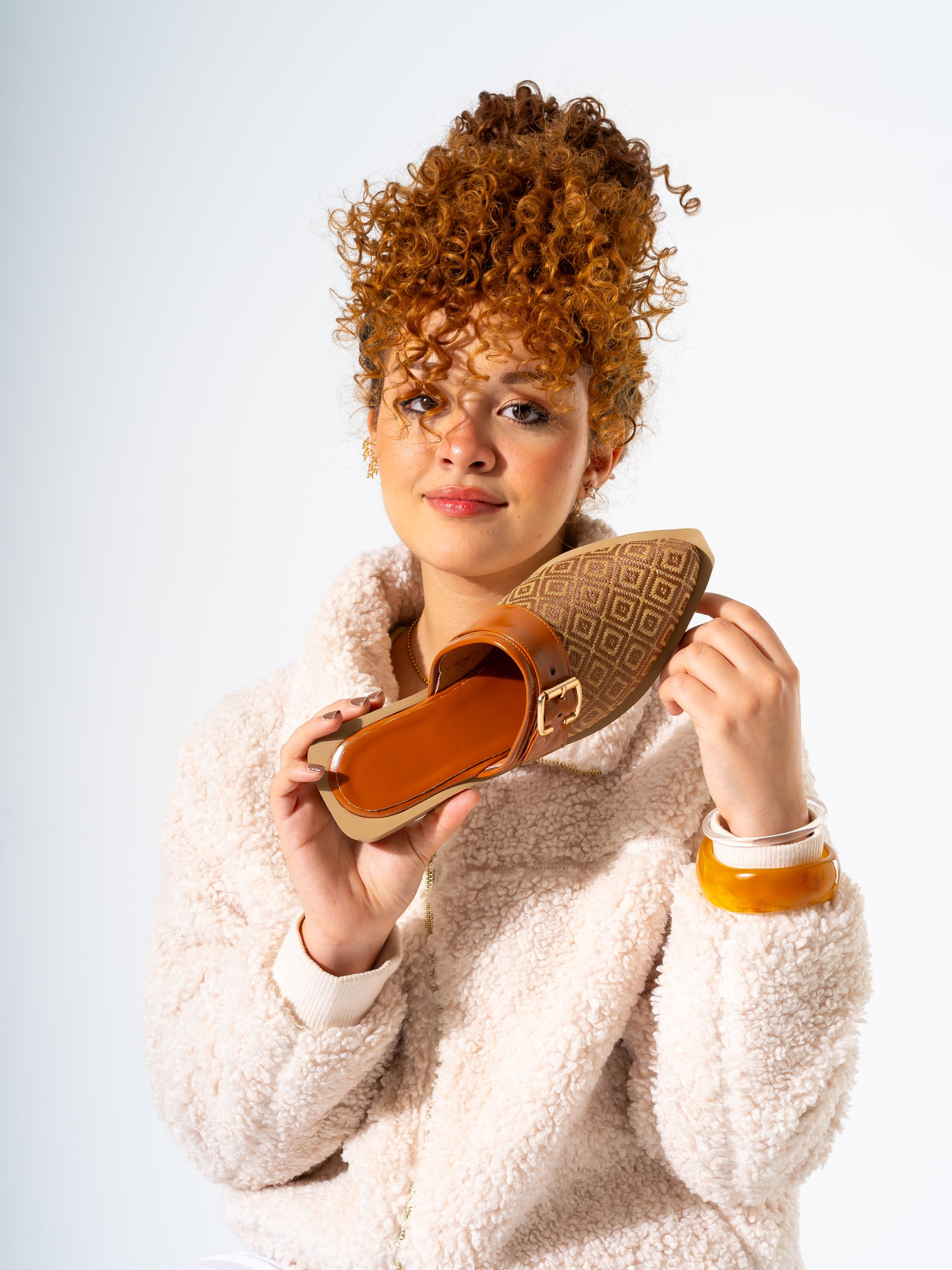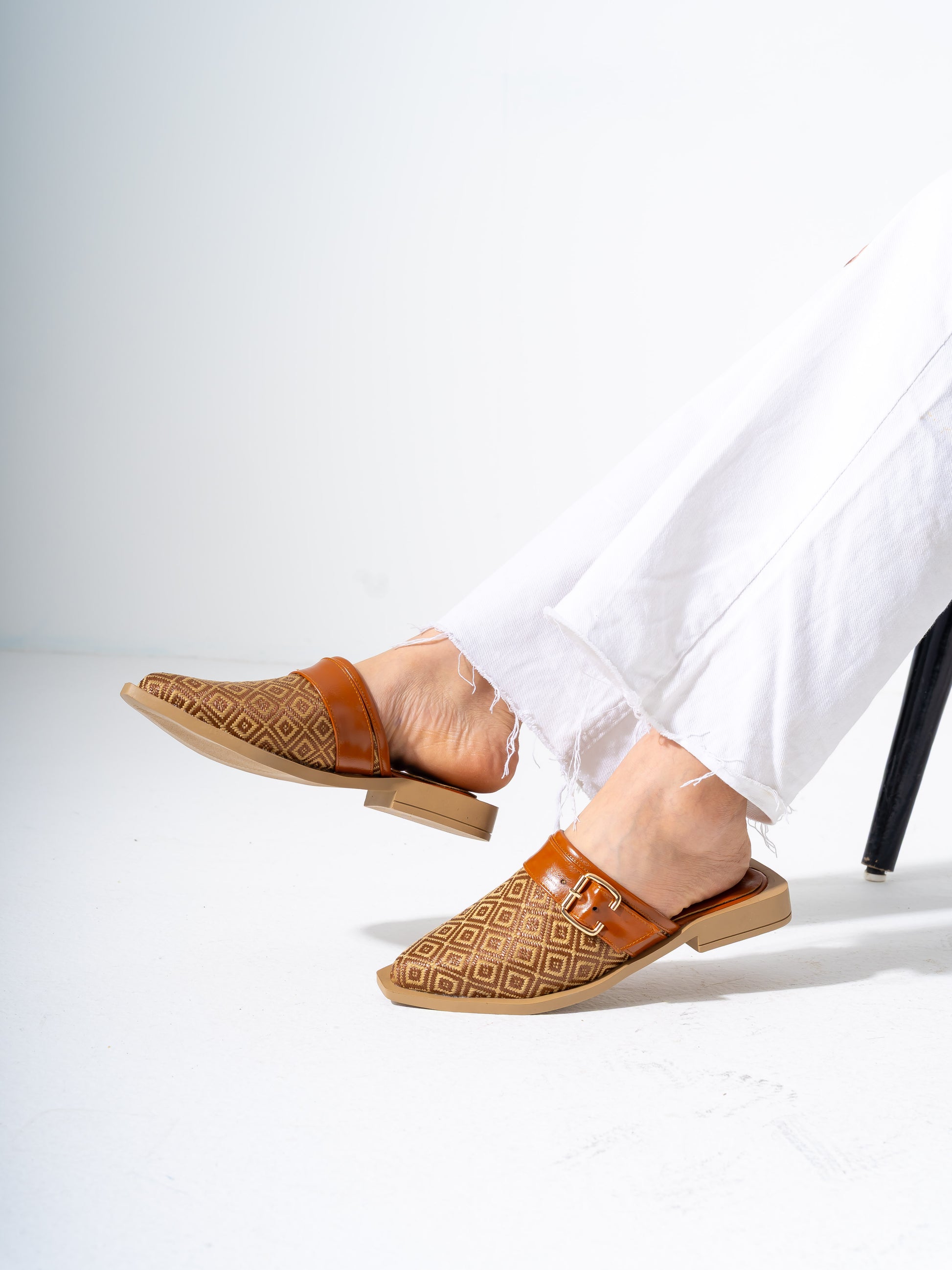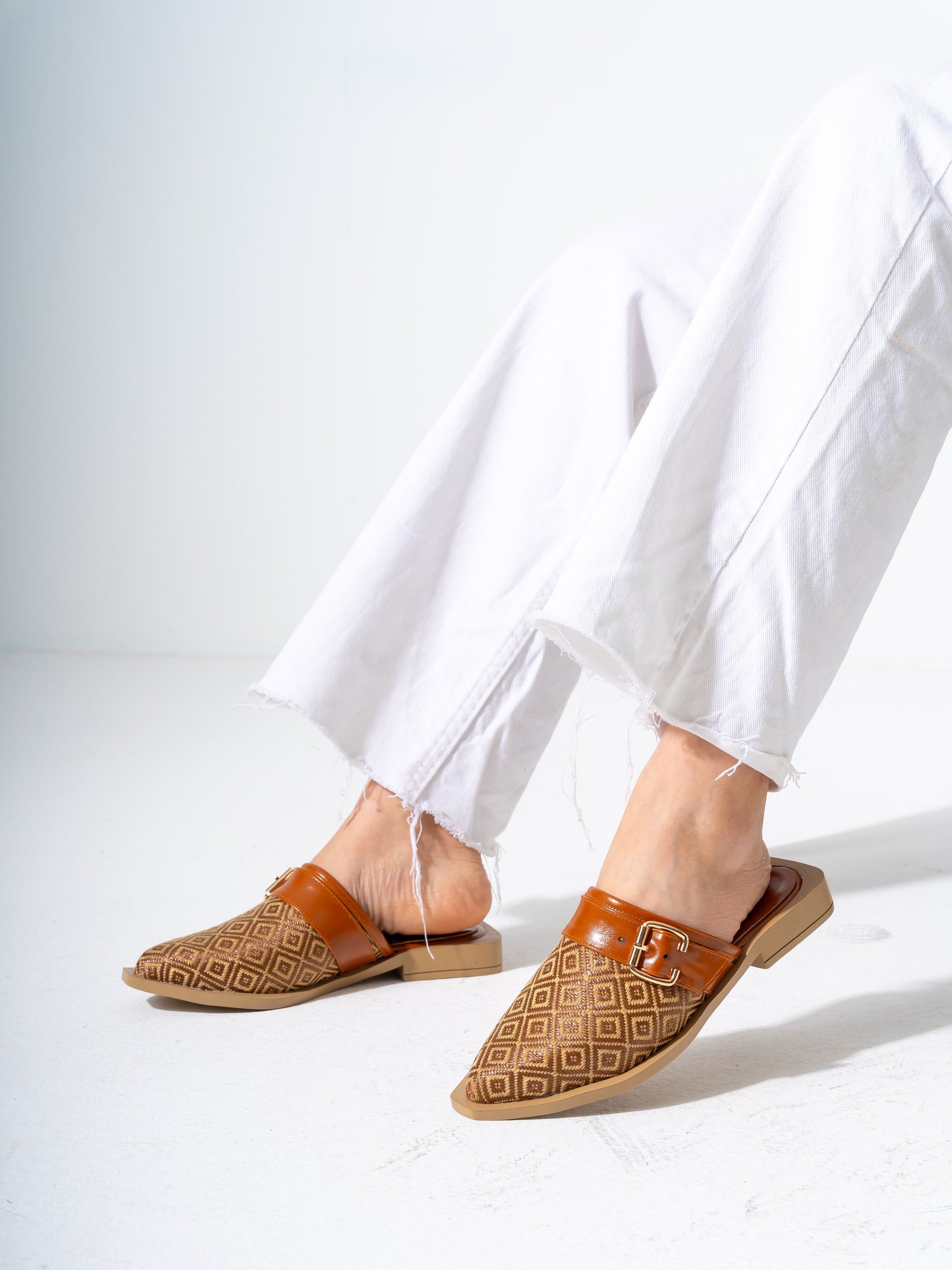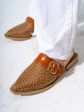 Geometric Pattern Buckle Pointed-Toe Mules-CAMEL