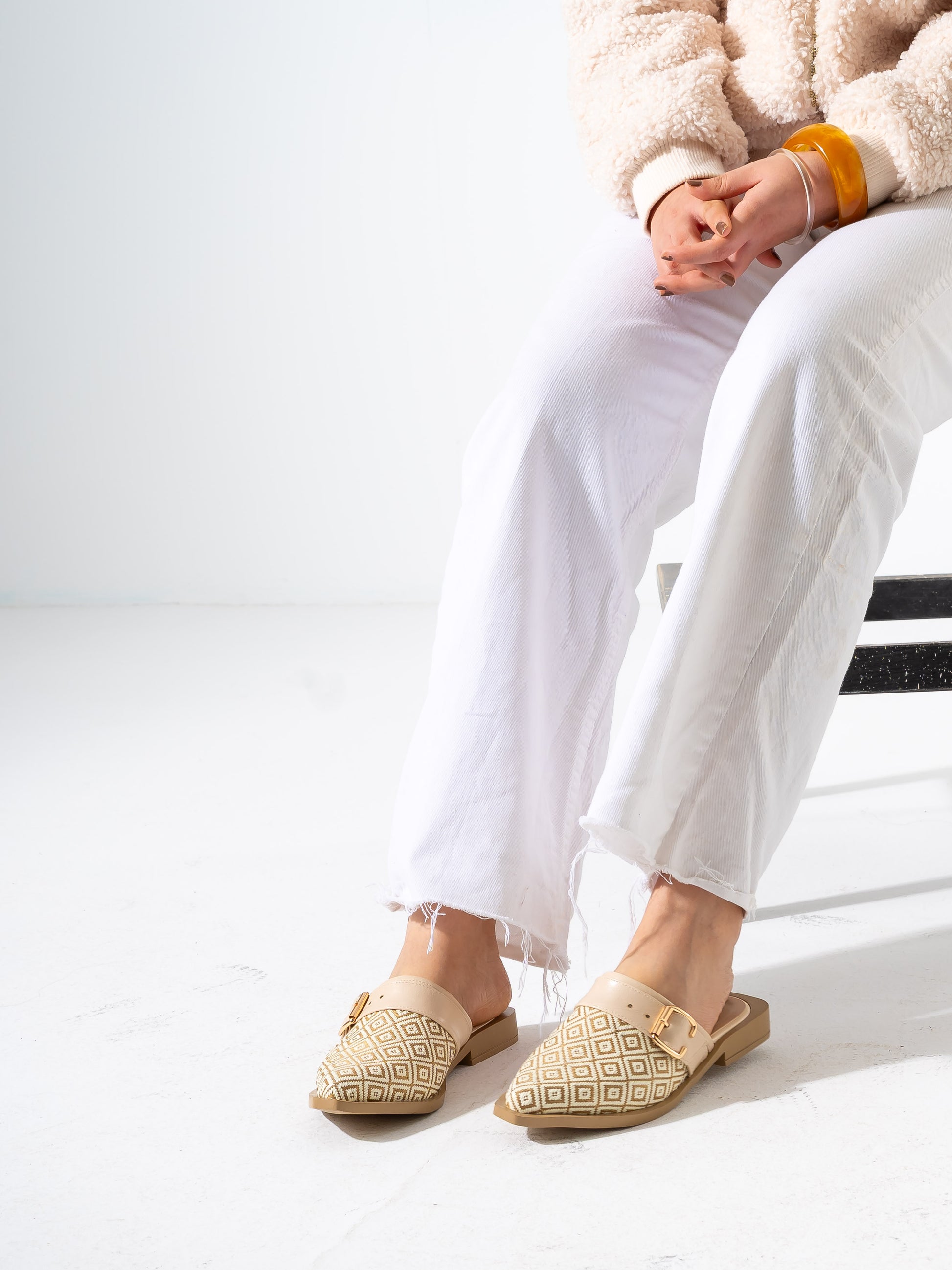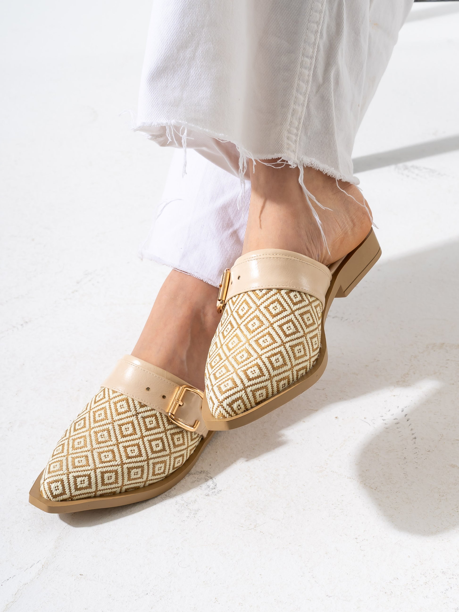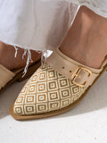 Geometric Pattern Buckle Pointed-Toe Mules-BEIGE