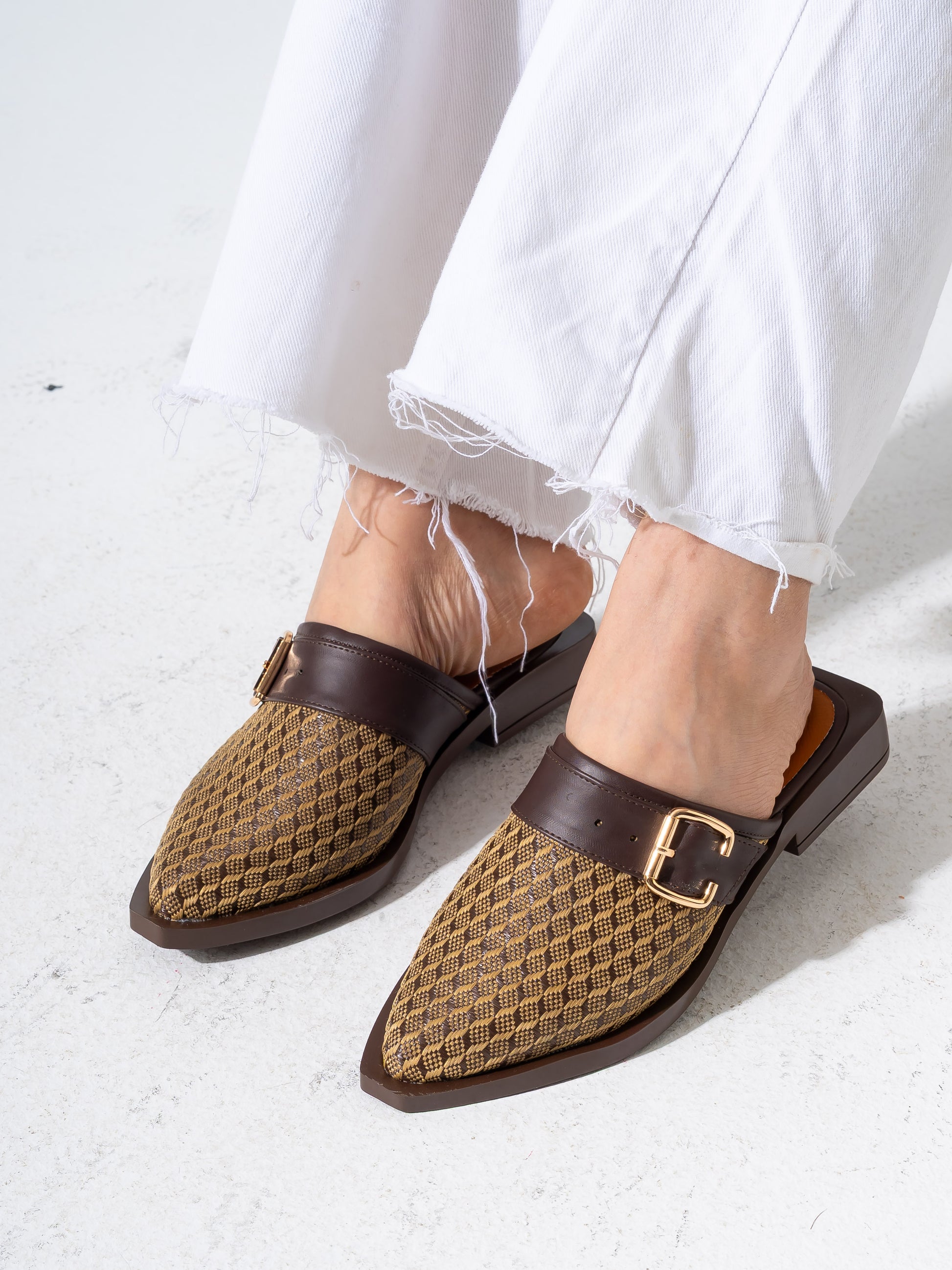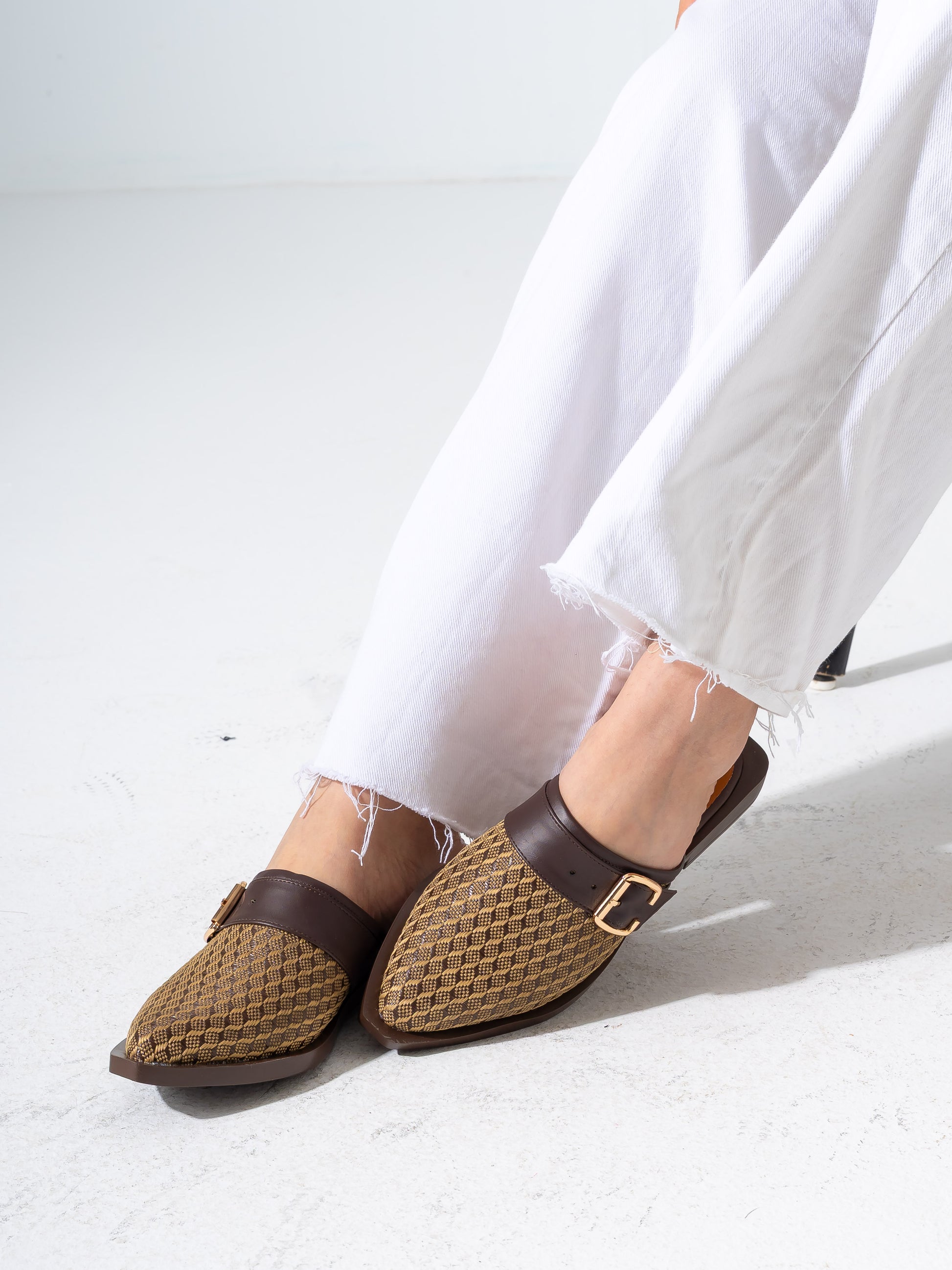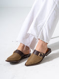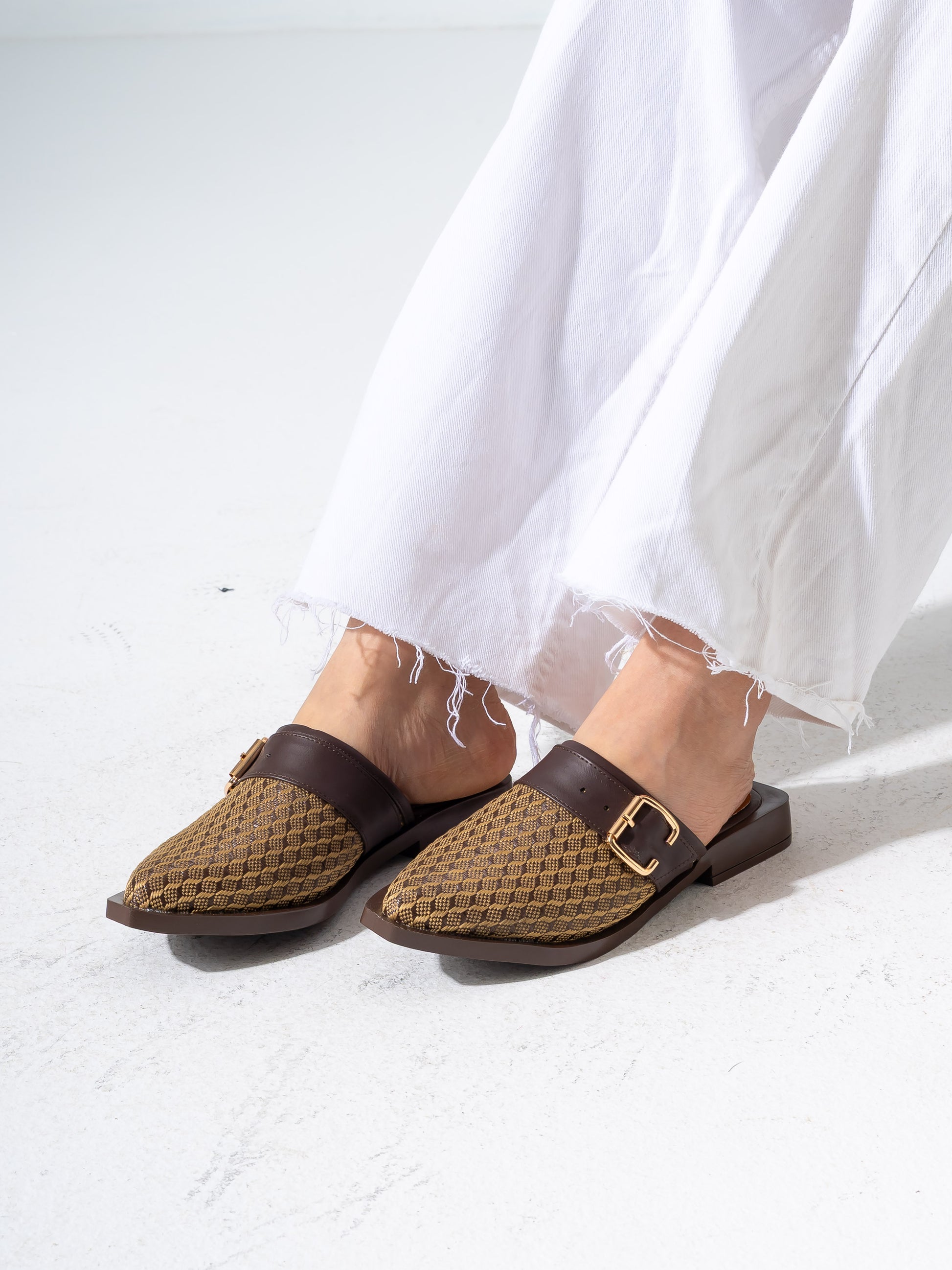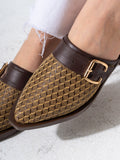 Honeycomb Textured Buckle Mules-BROWN