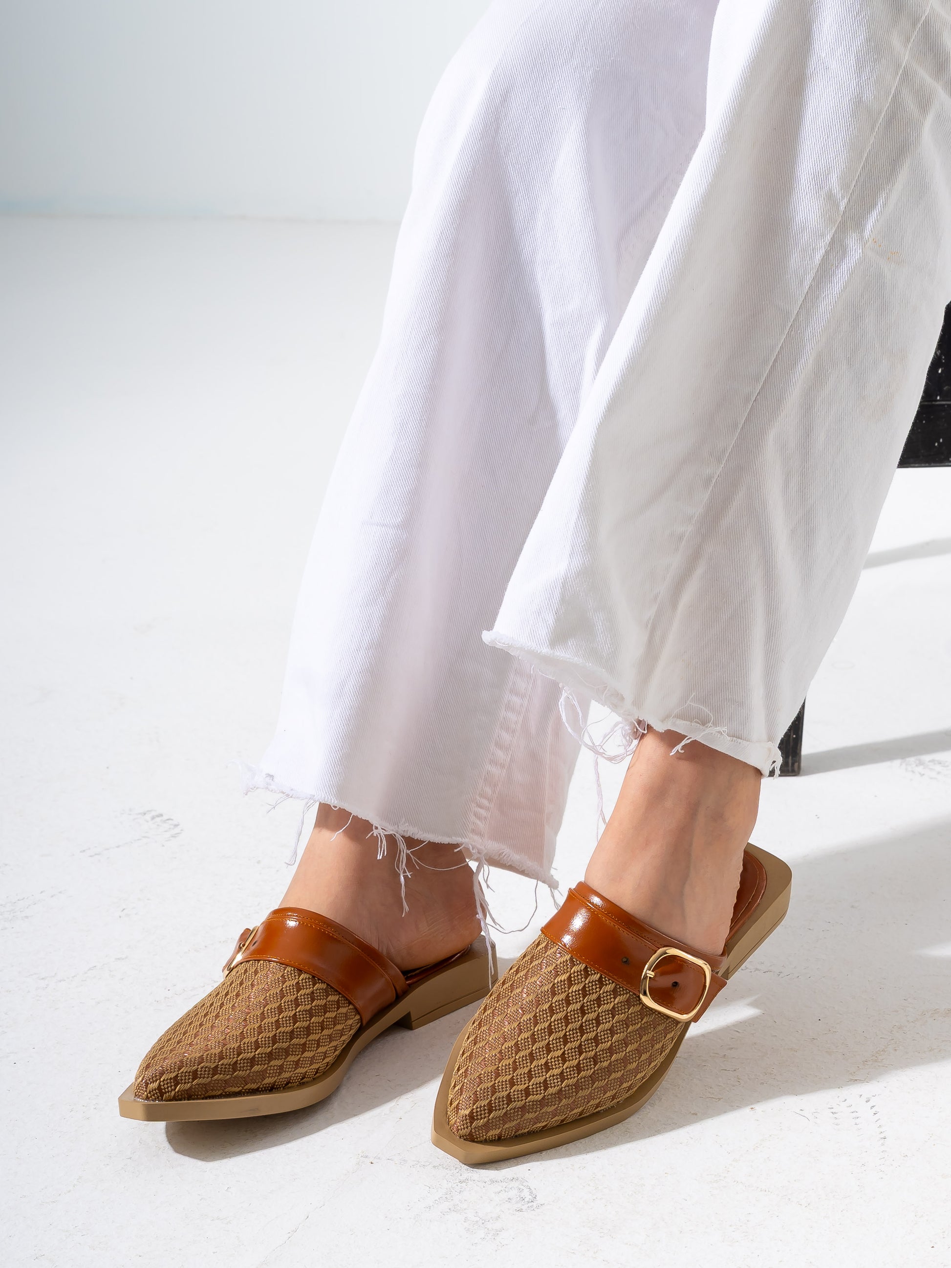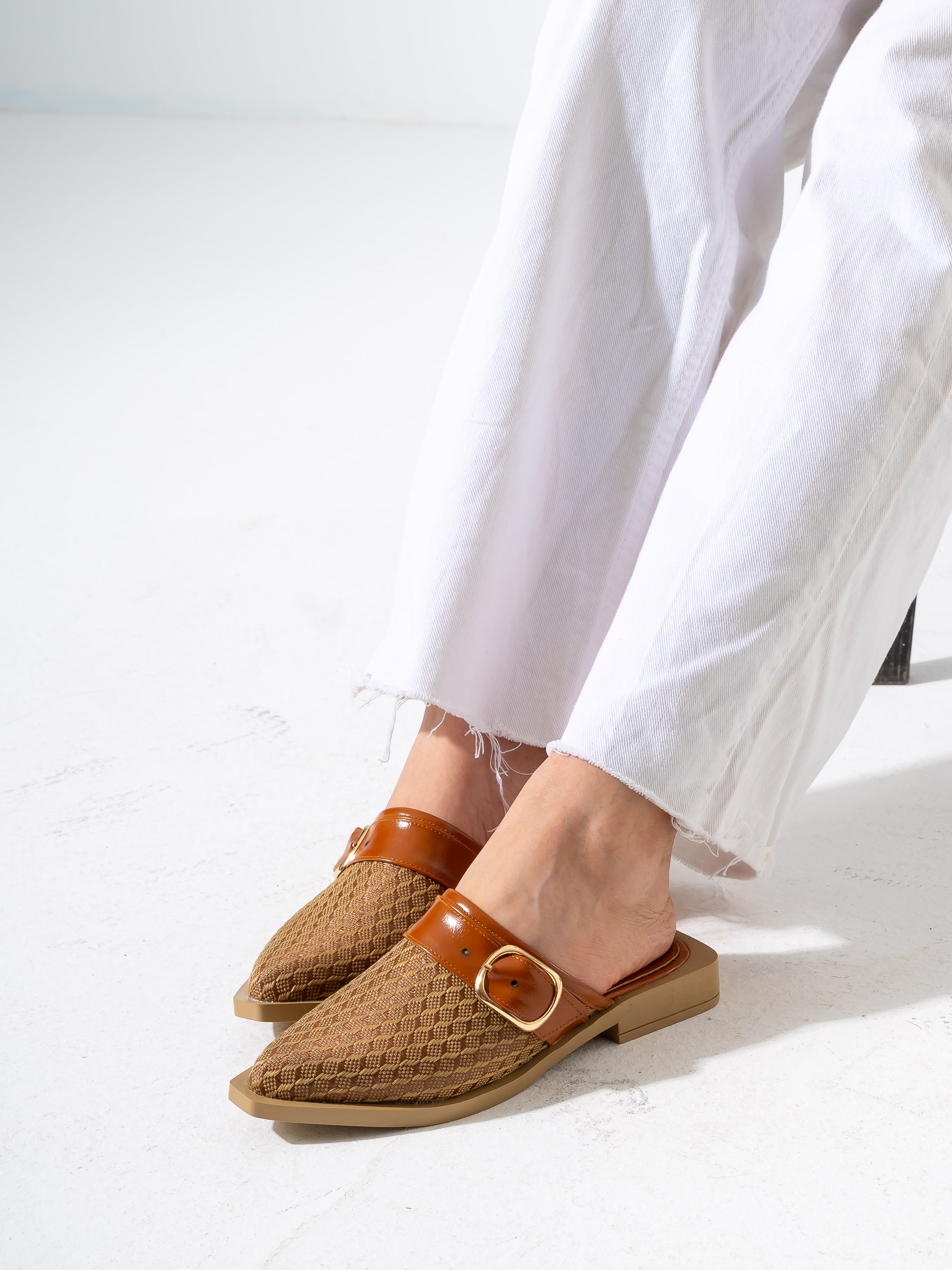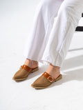 The design is elevated by a sleek strap across the vamp, finished with a polished metallic buckle for a touch of timeless elegance. With their effortless slip-on style and comfortable low-profile sole, these mules are the perfect versatile choice for everything from professional office wear to chic weekend outings.