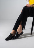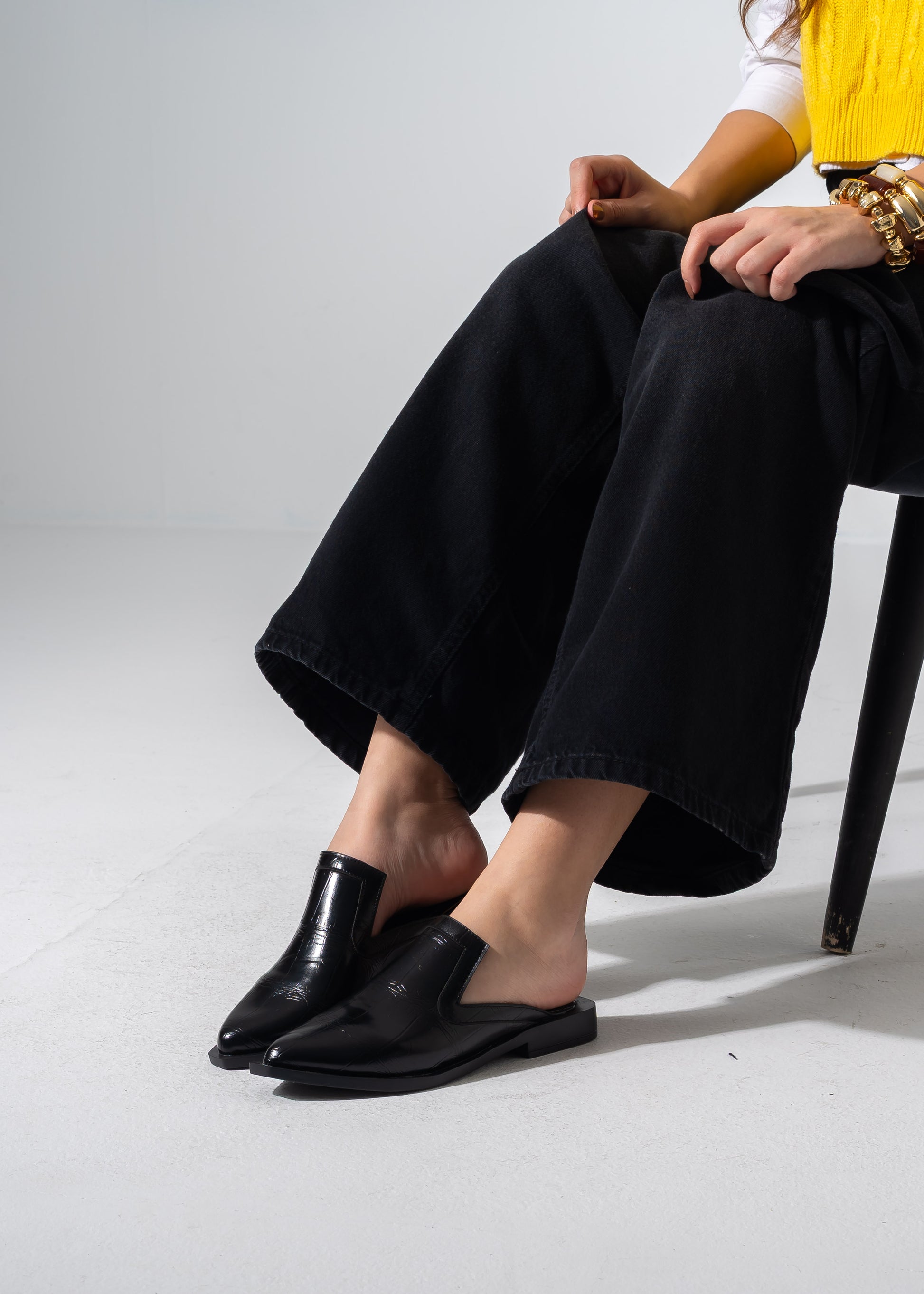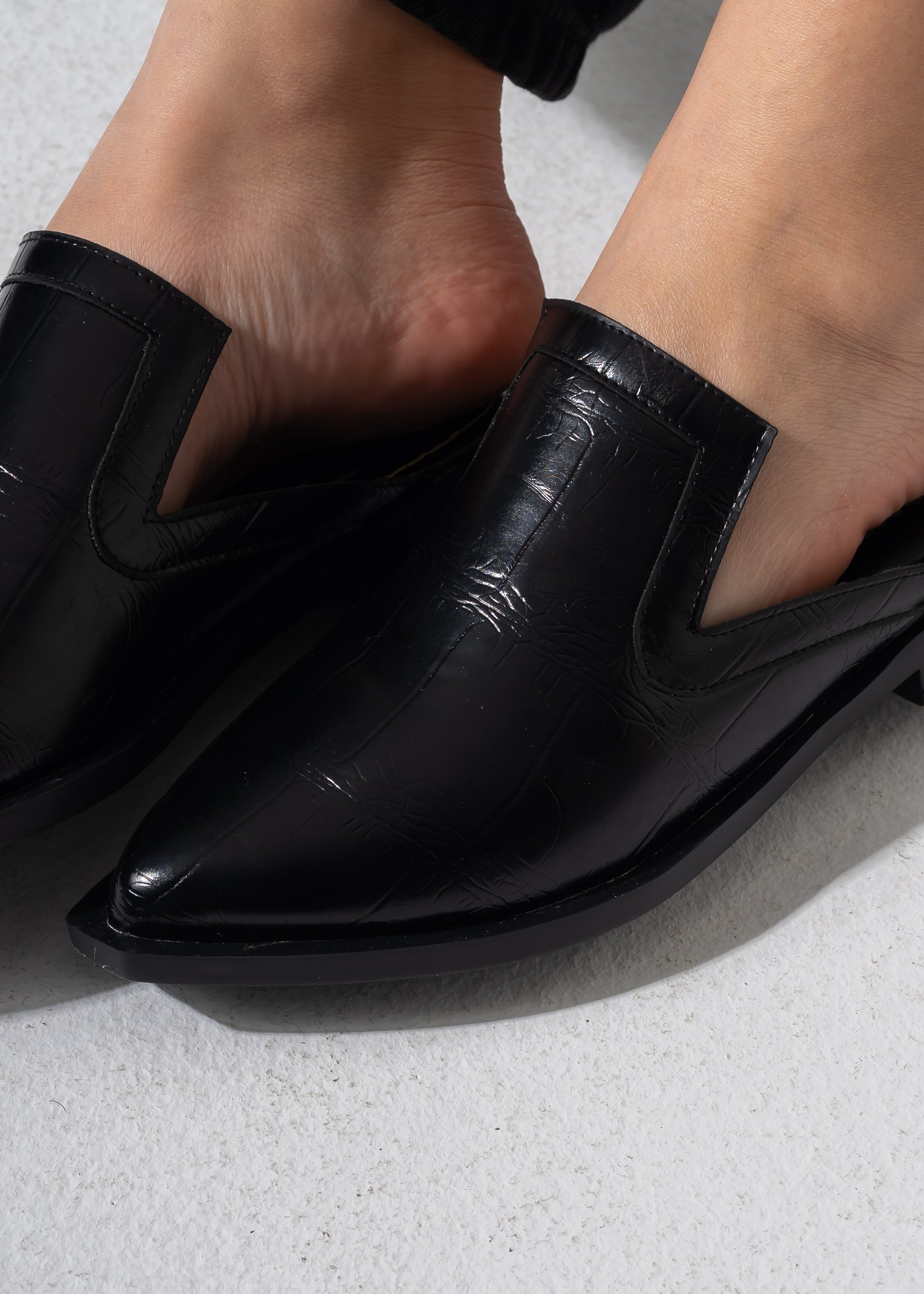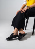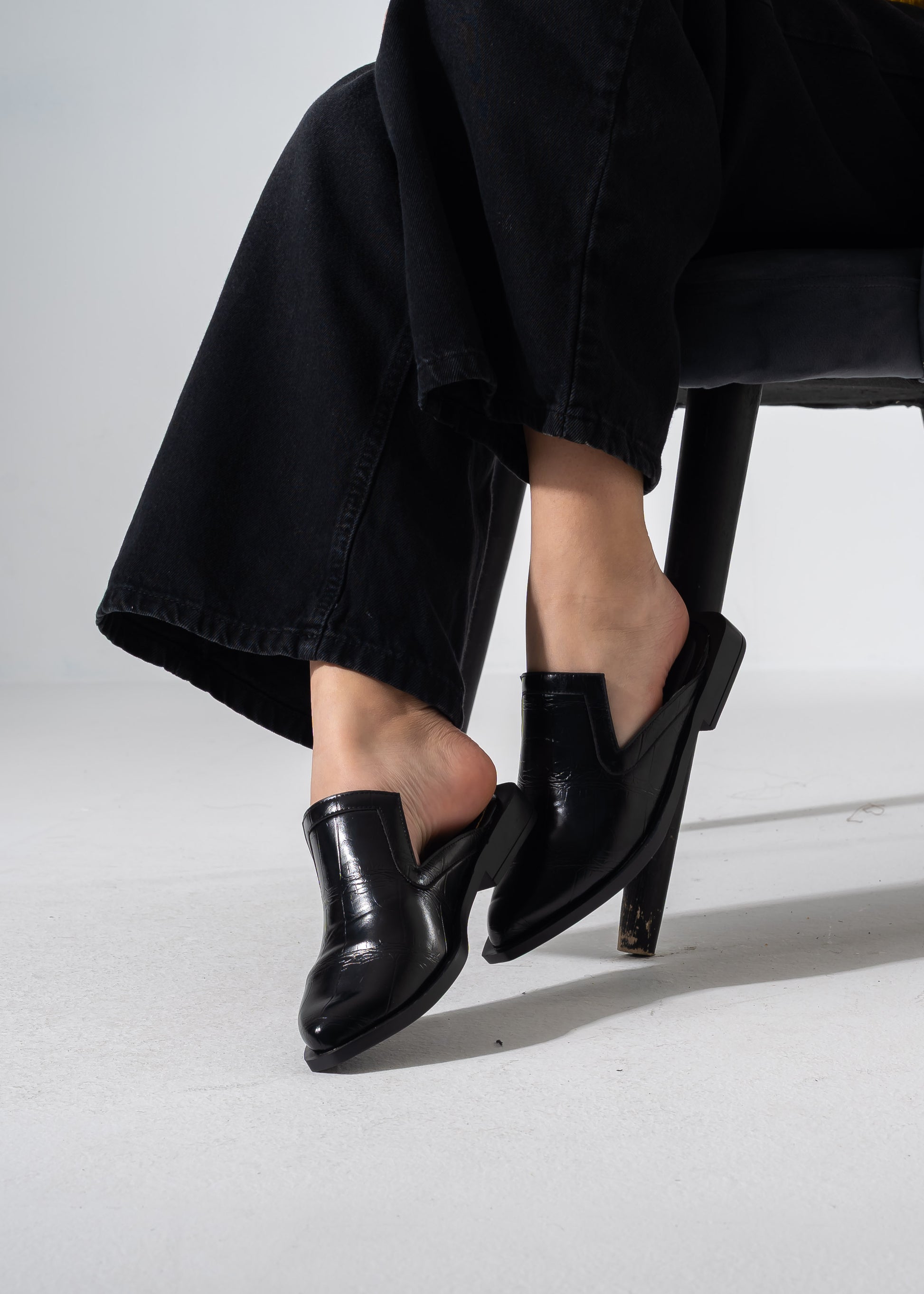 V-Cut Textured Flat Mules - BLACK
