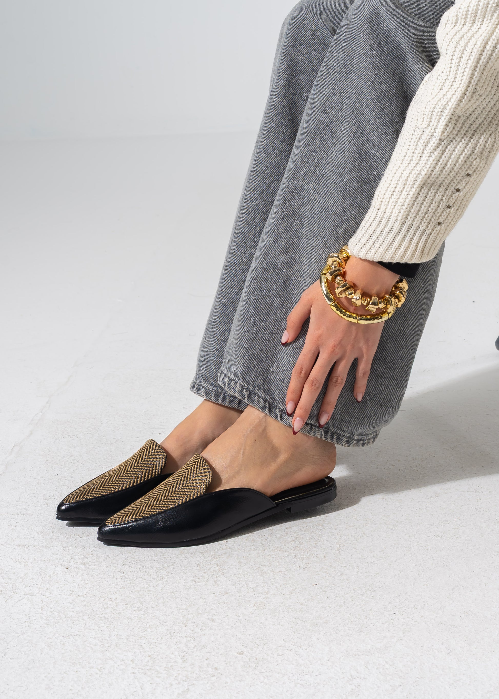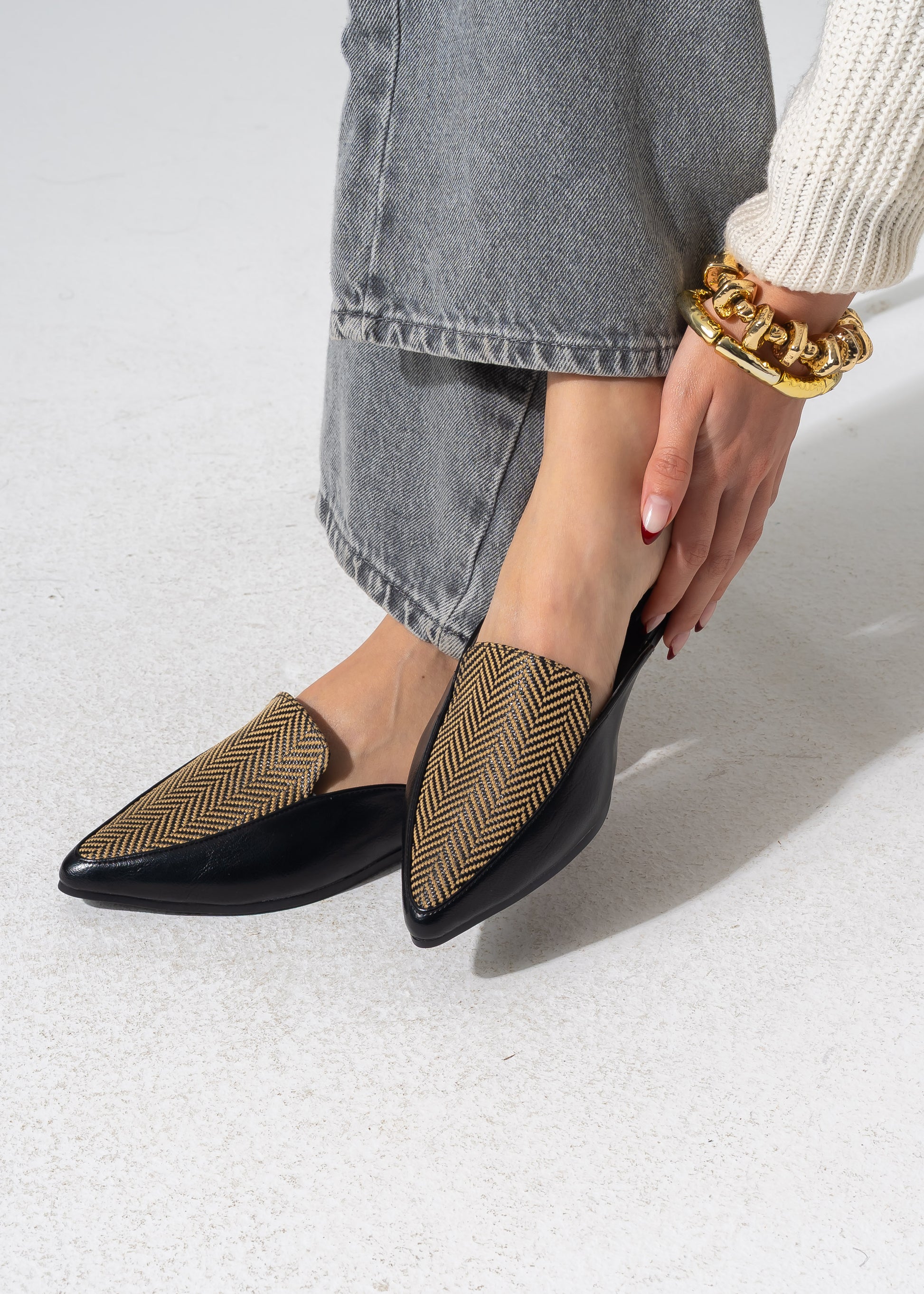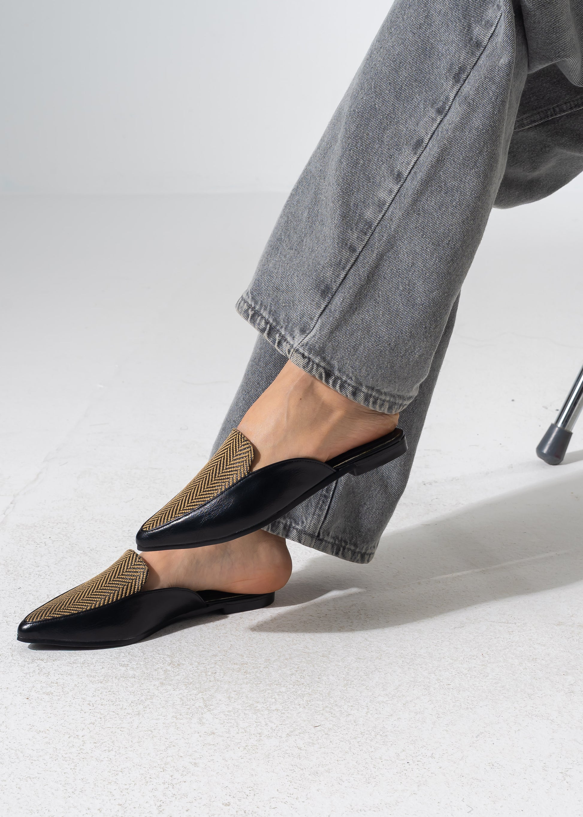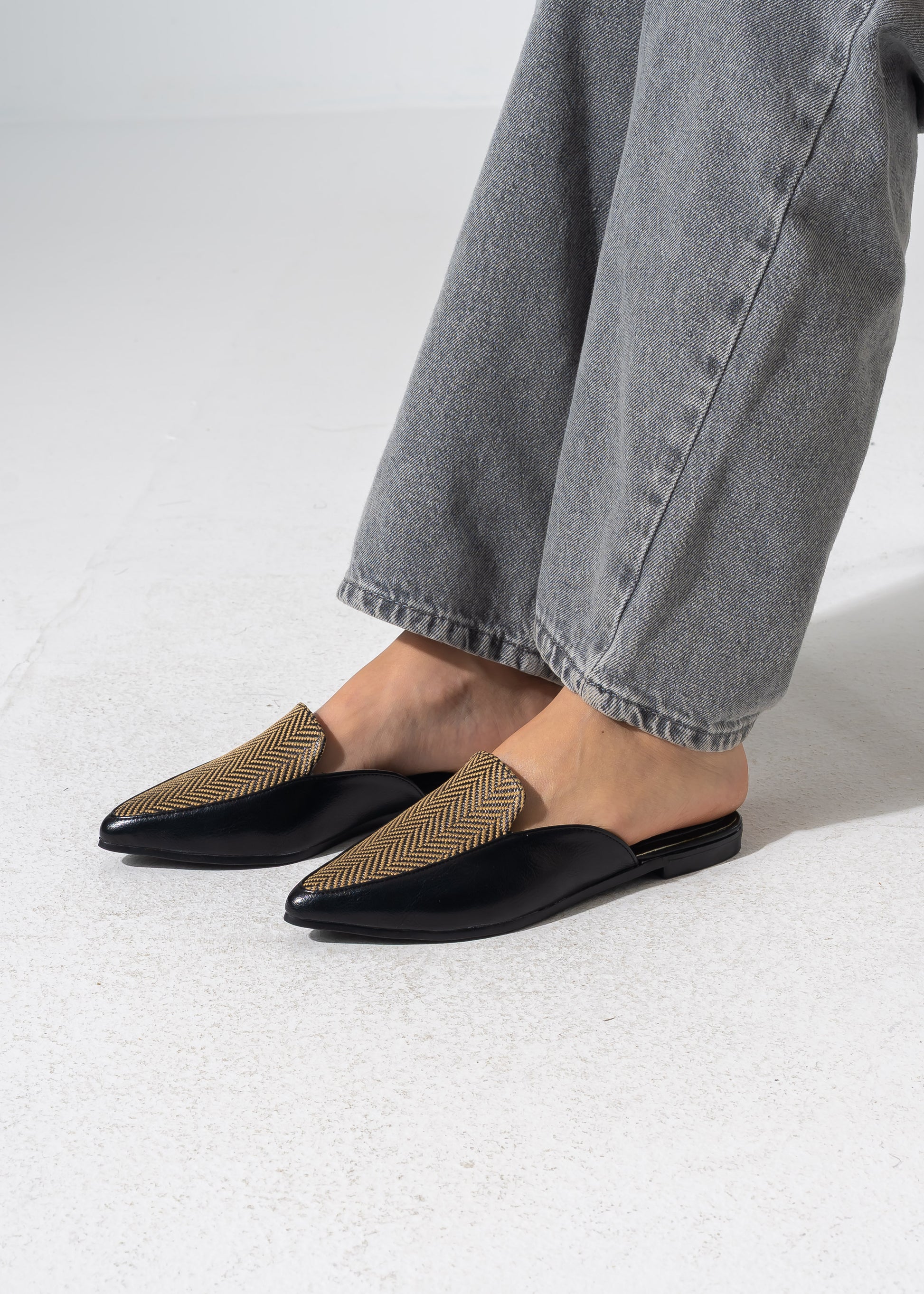 Pointed-Toe Herringbone Weave Mules - BLACK